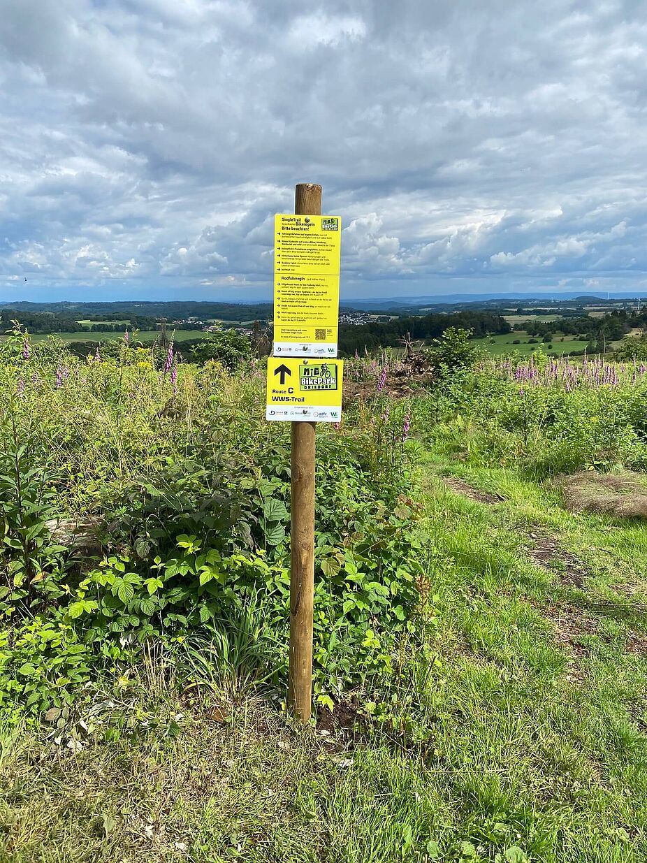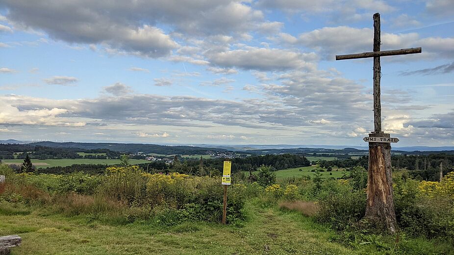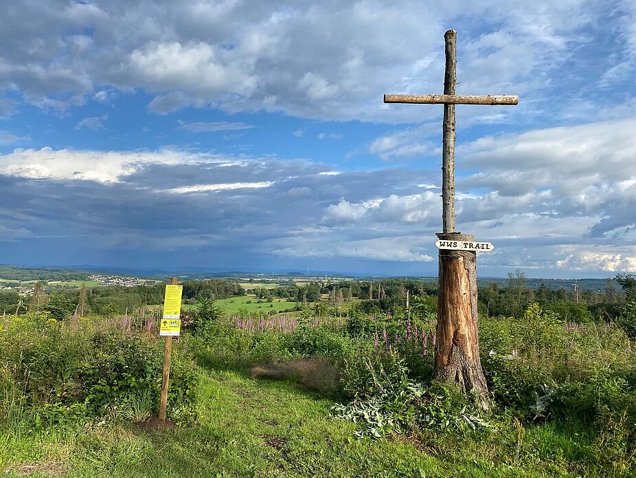 Die Zufahrt zu den Trails steigt gleichmäßig an und belohnt mit einem tollen Weitblick von dem 642,8 m hohen Höllkopf, dem höchsten hessischen Berg im Westerwald.